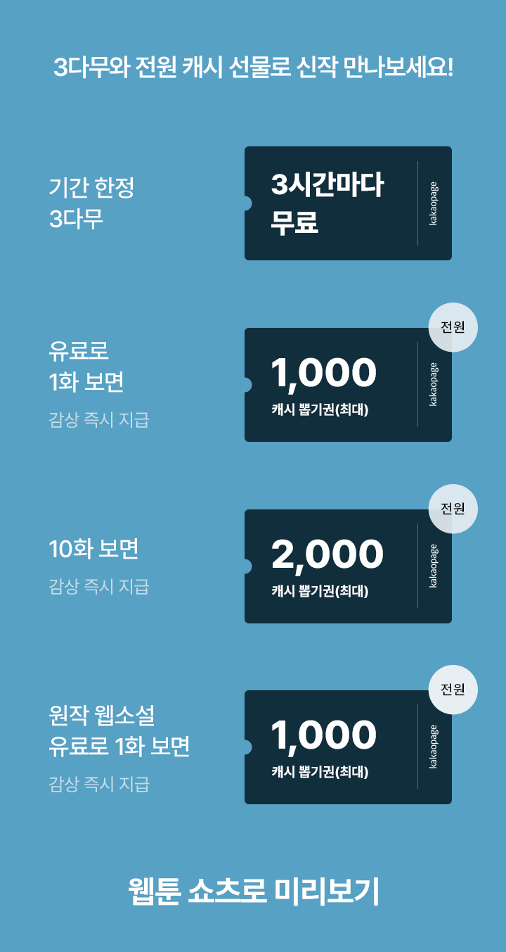 원작 웹소설 유료로 1화 보면, 최대 1,000캐시 뽑기권 (전원, 감상 즉시 지급)