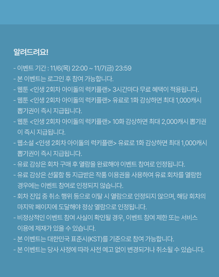 - 웹툰 <인생 2회차 아이돌의 럭키플랜> 유료로 1화 감상하면 최대 1,000캐시 뽑기권이 즉시 지급됩니다.