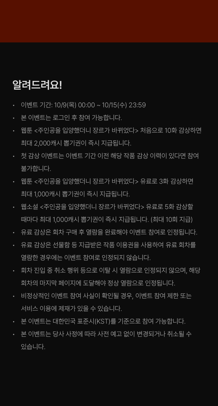 유료 감상은 선물함 등 지급받은 작품 이용권을 사용하여 유료 회차를 열람한 경우에는 이벤트 참여로 인정되지 않습니다.