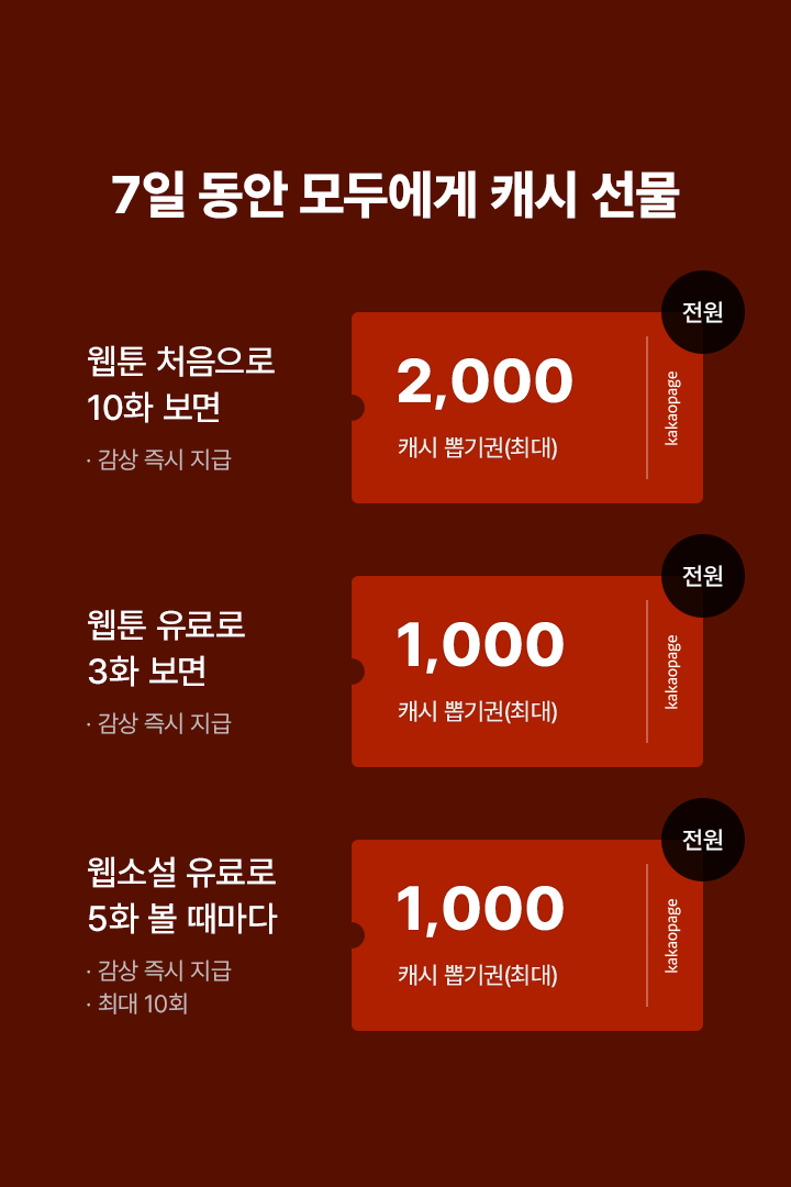 웹소설 유료로 5화 볼 때마다 최대 1,000캐시 뽑기권 (전원, 감상 즉시 지급, 최대 10회)