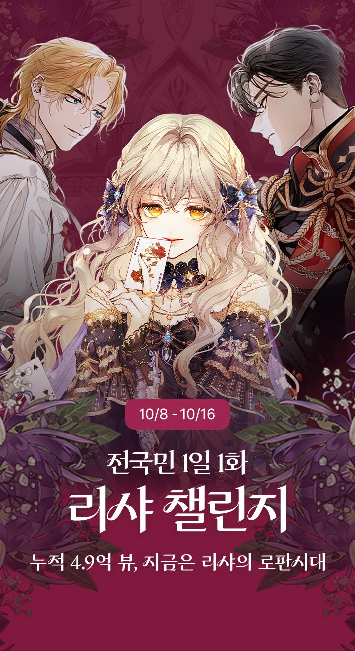 - 1화가 아쉽다면? 출구는 없어, 리샤 베스트셀러 몰아보기! 유료로 5화 감상할 때마다 최대 1,000캐시 뽑기권 (전원, 즉시 지급, 각 작품별 최대 5회, 총 이벤트 기간 내 1회 참여 가능)