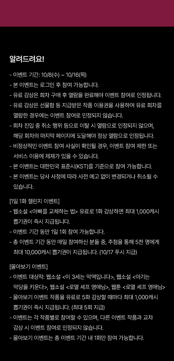 - - 이벤트는 각 작품별로 참여할 수 있으며, 다른 이벤트 작품과 교차 감상 시 이벤트 참여로 인정되지 않습니다.