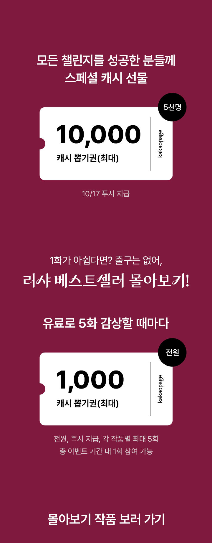 - - 몰아보기 이벤트 작품을 유료로 5화 감상할 때마다 최대 1,000캐시 뽑기권이 즉시 지급됩니다. (최대 5회 지급)