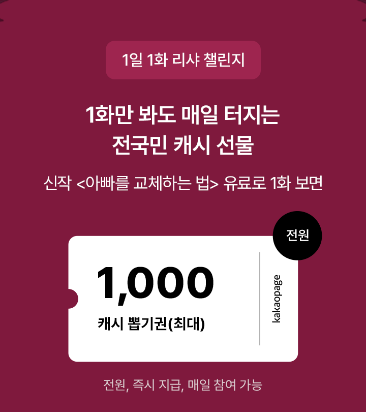 - - 웹소설 <아빠를 교체하는 법> 유료로 1화 감상하면 최대 1,000캐시 뽑기권이 즉시 지급됩니다.