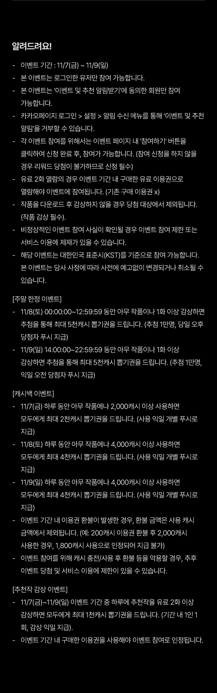 - 11/7(금)~11/9(일) 이벤트 기간 중 하루에 추천작을 유료 2화 이상 감상하면 모두에게 최대 1천캐시 뽑기권을 드립니다. (기간 내 1인 1회, 감상 익일 지급).