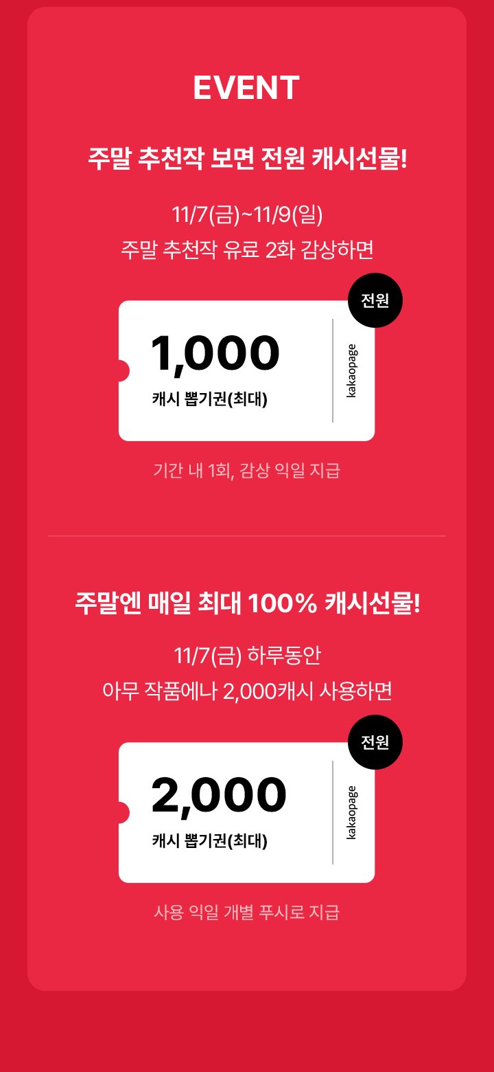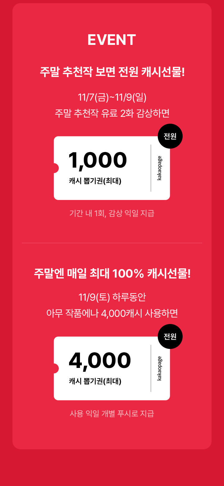 11/7(금) ~ 11/9(일) 기간 동안 주말 추천작 유료 2화 감상하면 최대 1,000캐시 뽑기권 (전원, 기간 내 1회, 감상 익일 지급)
