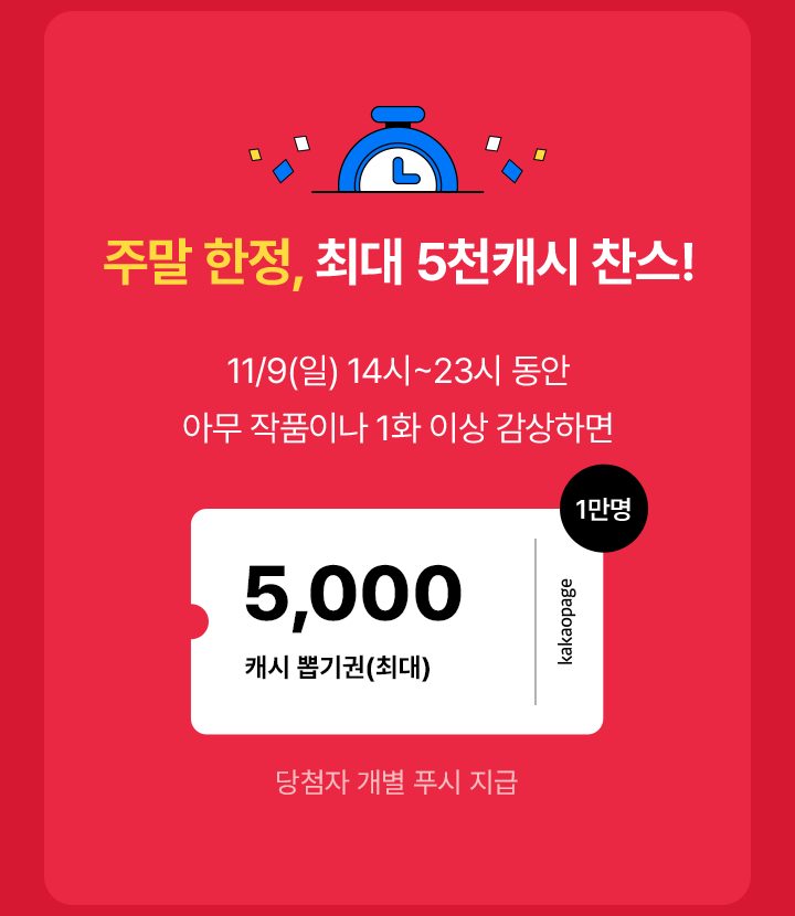 - 11/8(토) 00:00:00~12:59:59 동안 아무 작품이나 1화 이상 감상하면 추첨을 통해 최대 5천캐시 뽑기권을 드립니다. (추첨 1만명, 당일 오후 당첨자 푸시 지급)