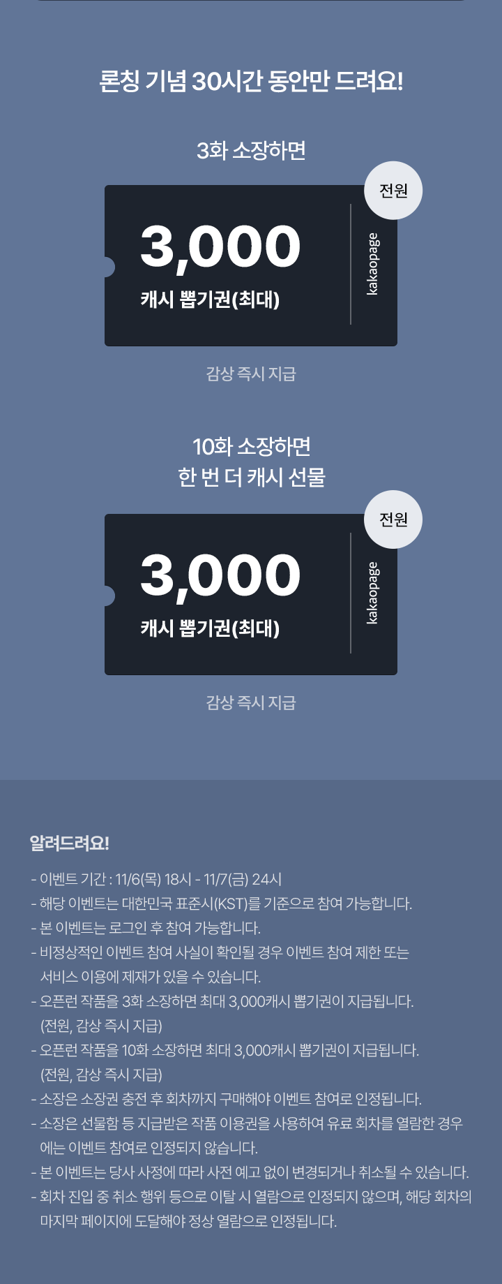 유료로 3화 보면, 최대 3,000캐시 뽑기권 (전원, 감상 즉시 지급)