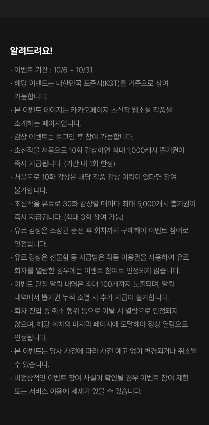 - 본 이벤트 페이지는 키카오페이지 초신작 웹소설 작품을 소개하는 페이지입니다.